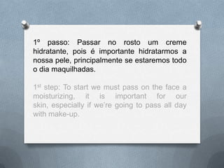 Este documento fornece um guia de 13 passos para uma maquiagem de regresso às aulas, começando com a hidratação da pele e aplicação de base, contorno do rosto com bronzer e blush, sombras de olhos marrons e rosa, delineador preto, rímel e batons nudes ou vibrantes.