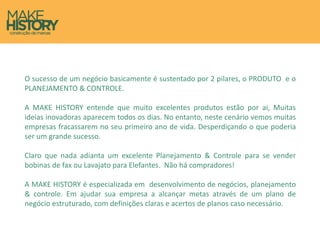 O documento discute como o sucesso de um negócio depende de dois pilares: produto e planejamento e controle. Muitas empresas fracassam no primeiro ano devido a falta de planejamento, mesmo tendo bons produtos. A empresa MAKE HISTORY oferece serviços de desenvolvimento de negócios, planejamento e controle para ajudar empresas a alcançarem suas metas através de um plano de negócios estruturado.