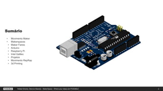 O documento descreve o movimento maker, incluindo makerspaces, feiras maker, plataformas como Arduino e Raspberry Pi, e projetos feitos com essas ferramentas como um sistema de gerenciamento de eventos e um rastreador de ônibus. Impressoras 3D e o movimento RepRap também são discutidos.