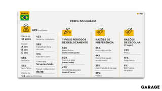 O documento apresenta um plano de marketing digital mobile-first para uma empresa de transporte por aplicativo. Ele descreve a segmentação do público-alvo em clusters, a jornada de mídia planejada com diferentes campanhas ao longo do tempo e canais, e uma abordagem experimental inspirada em startups para otimizar rapidamente as campanhas com base em métricas de performance.