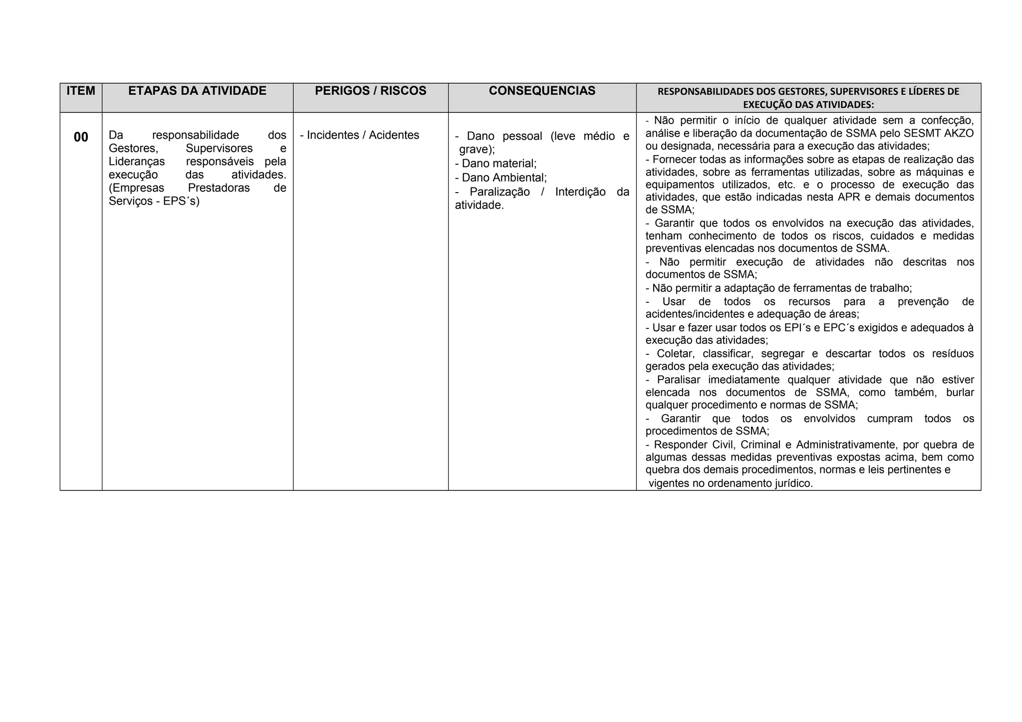 O documento descreve as responsabilidades dos gestores e supervisores para garantir a segurança nas atividades. Devem eles garantir que todos os envolvidos tenham conhecimento dos riscos e medidas preventivas, não permitir atividades não descritas nos documentos de segurança, e paralisar qualquer atividade que não siga os procedimentos.