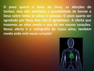 Este documento discute os perigos de honrar mais as autoridades humanas do que a Deus, oferecendo cultos inúteis a Deus sem sinceridade e desprezando a importância do culto divino. O povo preferia agradar aos governantes do que a Deus e ofereciam presentes piores a Deus. Deus prefere obediência e arrependimento a cultos hipócritas.