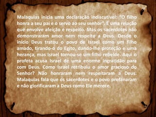 O documento discute os perigos de realizar cultos a Deus sem honrá-Lo sinceramente e oferecer-Lhe as melhores ofertas. Os sacerdotes e o povo de Israel estavam apenas cumprindo rituais sem respeito por Deus, oferecendo animais defeituosos em vez das melhores primícias. O profeta Malaquias adverte que Deus não aceita cultos hipócritas ou ofertas de sobras, mas requer que sejamos sinceros em nosso culto e deemos a Ele o nosso melhor.
