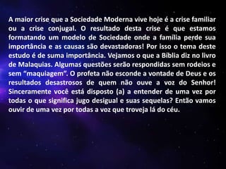 O documento discute os perigos dos casamentos mistos e do divórcio de acordo com o livro de Malaquias. Afirma que casamentos mistos quebram a aliança com Deus e levam ao desvio da fé. Também diz que o divórcio causa grande dor, afeta os filhos e provoca crises espirituais, levando ao repúdio de Deus. Conclui pedindo que se ensine às pessoas a vontade de Deus para o casamento e a família.
