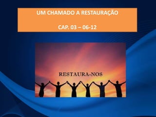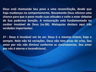 O documento discute a importância da restauração através da fidelidade no pagamento dos dízimos e ofertas. Deus chama Seu povo a mudar seus comportamentos para serem abençoados novamente. O dízimo é um princípio estabelecido por Deus, não é opcional, e é necessário para sustentar a obra de Deus. A retenção dos dízimos é considerada roubo e leva à maldição divina.