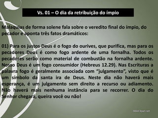 O documento resume o capítulo 4 do livro de Malaquias, falando sobre o dia final do julgamento. Nele, é destacado que (1) os pecadores serão condenados no fogo do juízo, enquanto os justos serão purificados; (2) os justos receberão a luz e alegria eterna, triunfando sobre os ímpios; e (3) Deus faz um último apelo para o arrependimento, através dos profetas, da lei e da transformação das famílias.