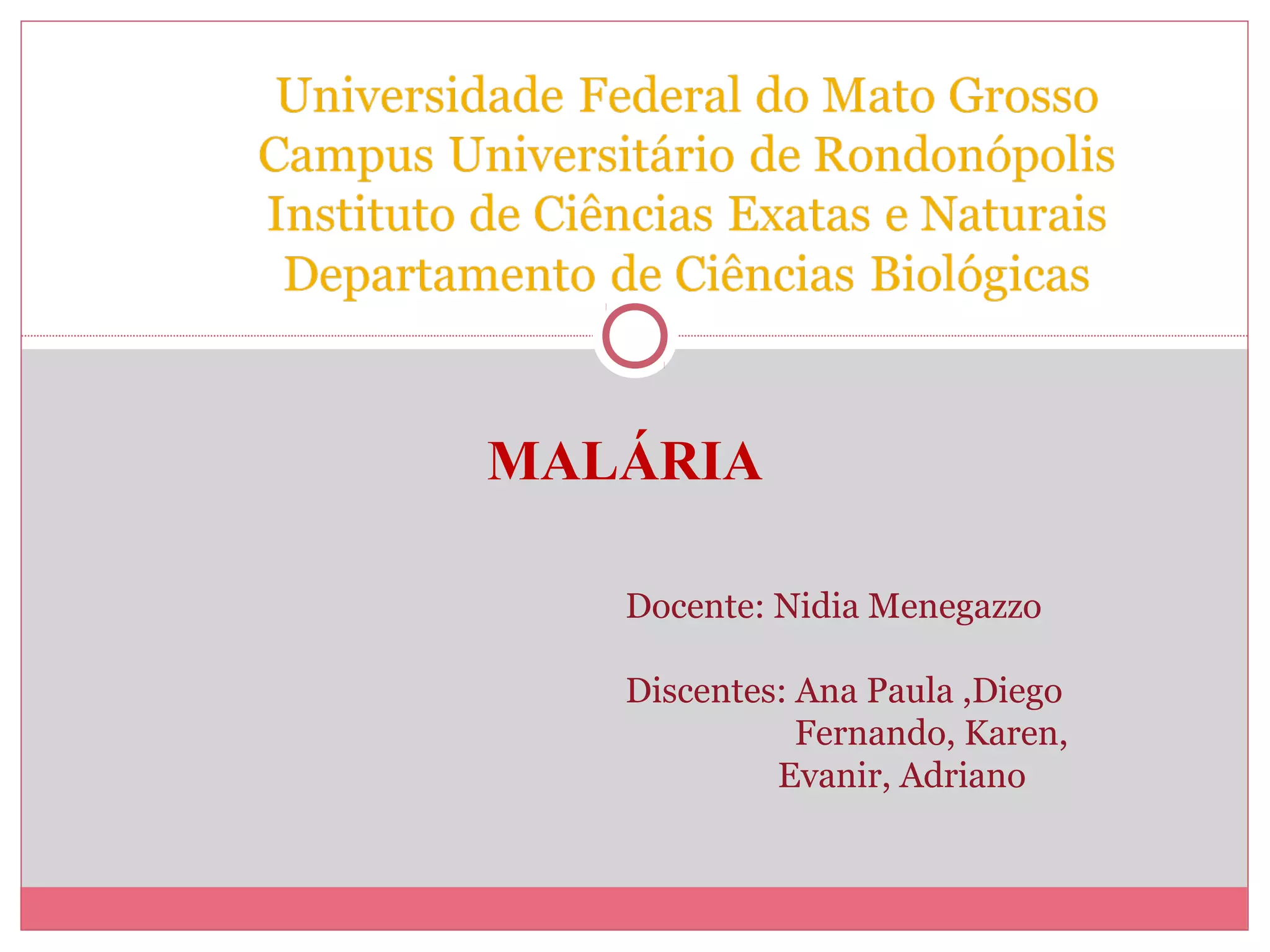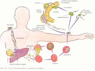 Este documento discute a malária, uma doença parasitária transmitida por mosquitos do gênero Anopheles. A malária é causada por parasitas do gênero Plasmodium e é uma das doenças que mais causa problemas de saúde em todo o mundo. O documento descreve o ciclo de vida do parasita, os sintomas da doença, formas de diagnóstico e espécies de Plasmodium que infectam humanos.