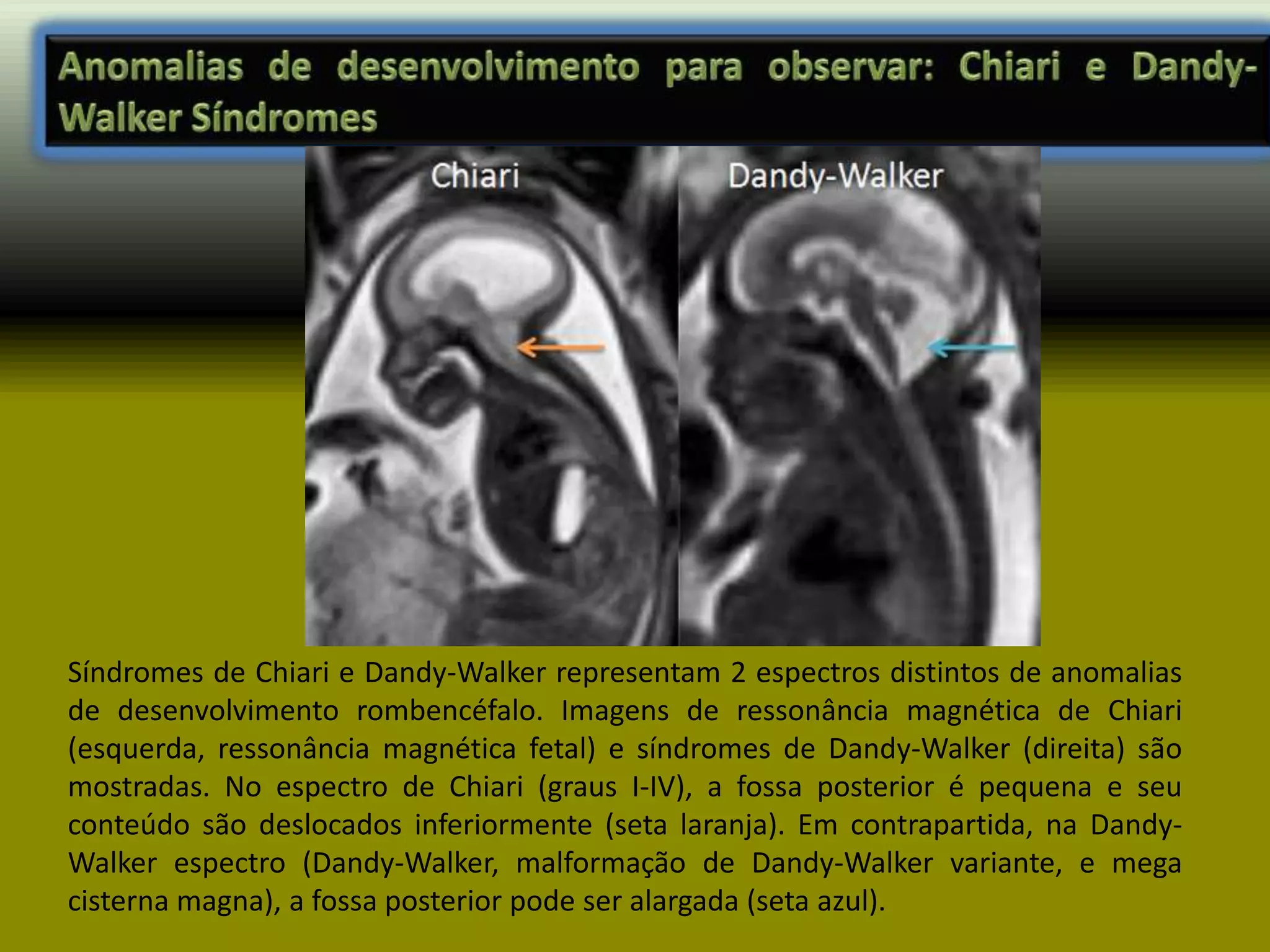 As síndromes de Chiari e Dandy-Walker representam diferentes anomalias do desenvolvimento do rombencéfalo, sendo Chiari caracterizada pela descida das amígdalas cerebelares e Dandy-Walker associada à dilatação do quarto ventrículo e hipoplasia do vermis cerebelar. As formas de Chiari incluem Chiari I, a mais comum, e Chiari II, frequentemente ligada à mielomeningocele, enquanto Dandy-Walker apresenta variações que vão de malformações graves a formas mais leves como a mega cisterna magna. O tratamento pode incluir descompressão cirúrgica e desvios ventrículos para aliviar os sintomas e complicações associadas.