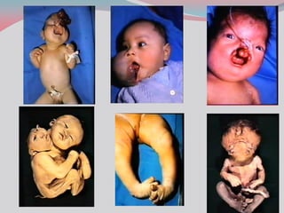 O documento descreve vários tipos de anomalias genéticas e fatores ambientais que podem causá-las, incluindo síndromes cromossômicas como Down e Turner, anomalias causadas por mutações genéticas, infecções maternas como rubéola e sífilis, exposição a radiação, drogas e álcool durante a gravidez. O pré-natal é importante para identificar problemas e manter a saúde da mãe e do feto.
