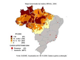 A malária é causada por parasitas do gênero Plasmodium transmitidos pela picada de mosquitos infectados do gênero Anopheles. A doença causa problemas de saúde e econômicos em todo o mundo, especialmente na Amazônia brasileira. Os principais sintomas incluem febre que se repete a intervalos regulares dependendo da espécie de Plasmodium. O diagnóstico é feito por exame de sangue e o tratamento envolve medicamentos como a quinina e a cloroquina.