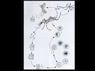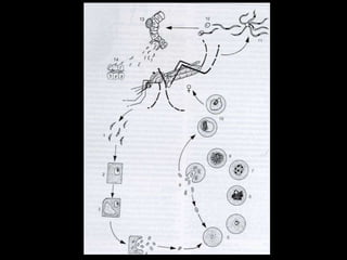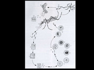 A malária é uma doença parasitária causada por três espécies de Plasmodium que afetam o homem através da picada do mosquito Anopheles. O ciclo da doença envolve uma fase no fígado e outra nas hemácias humanas, com a produção e disseminação de parasitas no sangue a cada 48, 72 ou 36 horas, dependendo da espécie. A transmissão ocorre quando os mosquitos ingerem gametócitos durante uma picada em um humano infectado e os esporozoítos são posteriormente inoculados em outro