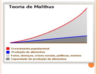 A teoria malthusiana prevê que a população cresce geometricamente enquanto a produção de alimentos aumenta aritmeticamente, levando a fome. Malthus propôs abstinência sexual e casamento tardio para controlar a população. Sua teoria recebeu críticas por ser muito pessimista e defender reduzir a natalidade dos pobres.