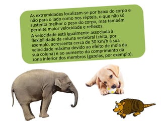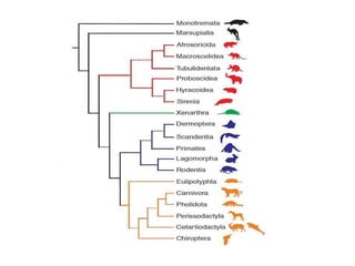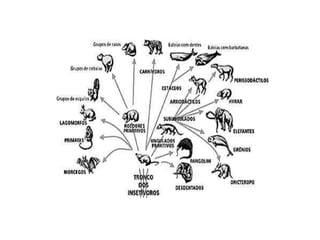 Os mamíferos são um grupo evoluído de cordados com características distintivas como glândulas mamárias, corpo peludo e capacidade de termorregulação. Eles se dividem em três grupos: monotremados, marsupiais e placentários, cada um com diferentes métodos de reprodução e desenvolvimento. Os mamíferos possuem sistemas complexos de comunicação e comportamento, o que lhes permite se adaptar a uma variedade de ambientes.