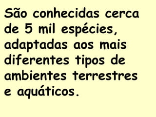 Os mamíferos são adaptados a diferentes ambientes terrestres e aquáticos, possuem pelos, glândulas e sistema digestivo completo. A respiração é pulmonar e a excreção é urinária através dos rins. A reprodução é sexuada e o desenvolvimento embrionário envolve a placenta em algumas espécies.