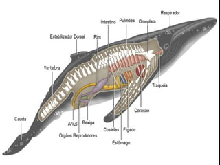 O documento descreve as principais características da classe Mammalia, incluindo que possuem pelos, três ossos no ouvido médio e são vivíparos. Além disso, discute as subclasses de mamíferos como monotremados, marsupiais e cetáceos.