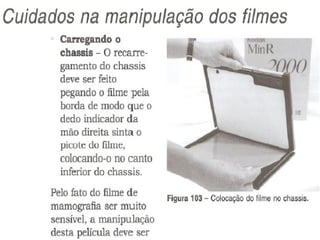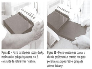Troca do Bucky A troca do bucky deve ser feita de forma cuidadosa para evitar rachaduras na bandeja que poderão causar incômodo para a paciente e dificultar o posicionamento durante o exame. Colocação do Chassis no equipamento: A colocação do chassis também deve ser feita de forma cuidadosa para evitar rachaduras nos cantos da bandeja.