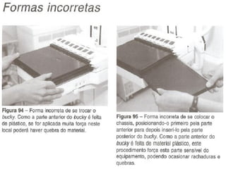 Cuidados com Écranse Chassis Limpeza dos écrans: A limpeza deve ser feita diariamente a seco, usando-se um pano macio, que não solte fios ou tinta, e um pincel feito de fibras macias. Não usar gaze, pois é áspera, ou algodão, pois solta pêlos. Semanal ou quinzenalmente, a limpeza deve ser feita com líquido antiestático próprio. Deve-se ter o cuidado de não fazer movimentos circulares, pois com isso só se espalha a sujeira.