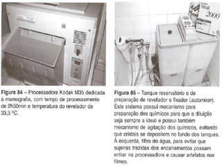 CUIDADOS COM A PROCESSADORA Em primeiro lugar é ideal trabalhar com uma processadora dedicada à mamografia. Este tipo de processadora química deve possuir um bom sistema de mistura e filtração dos químicos, rolos macios que não danifiquem a emulsão do filme, temperatura mais baixa do que as processadoras comuns e sem oscilações (33 a 35°) e tempo de revelação mais longo (2 a 3 minutos).