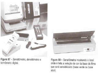 CONTROLE DE QUALIDADEDA PROCESSADORA A verificação da performance da processadora deve ser realizada diariamente com auxilio de um conjunto sensitômetro e densitômetro. A cada dia uma película radiográfica deverá ser sensibilizada com o sensitômetro. Após a revelação a densidade óptica das tiras sensitométricas deverá ser analisada com um densitômetro calibrado.