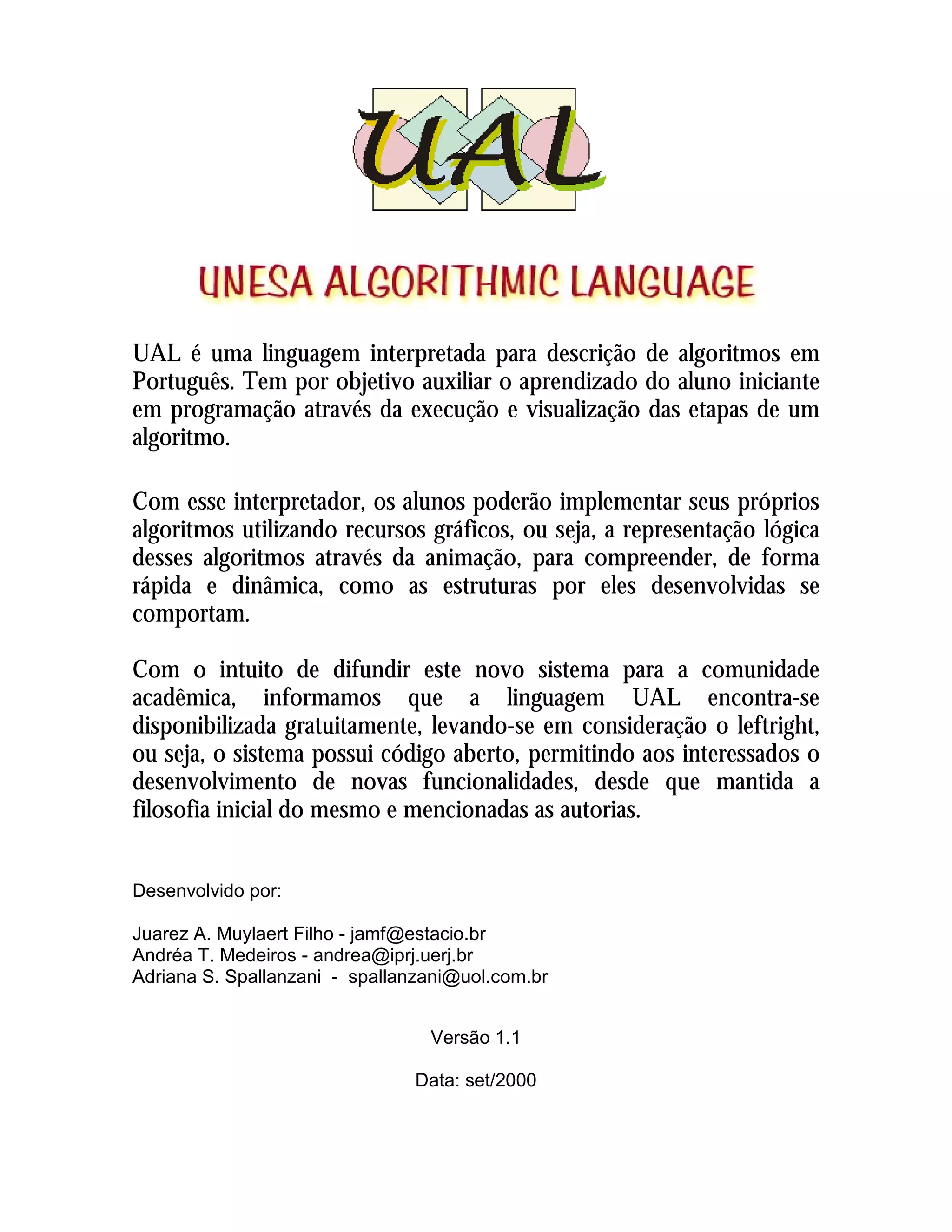 A linguagem UAL foi desenvolvida para auxiliar o aprendizado de programação de alunos iniciantes, permitindo a execução e visualização gráfica dos passos de um algoritmo. O documento descreve os principais recursos da linguagem, como declaração de variáveis, tipos de dados, operadores, comandos de entrada/saída, repetição e tomada de decisão. A linguagem está disponível gratuitamente e com código aberto para desenvolvimento.
