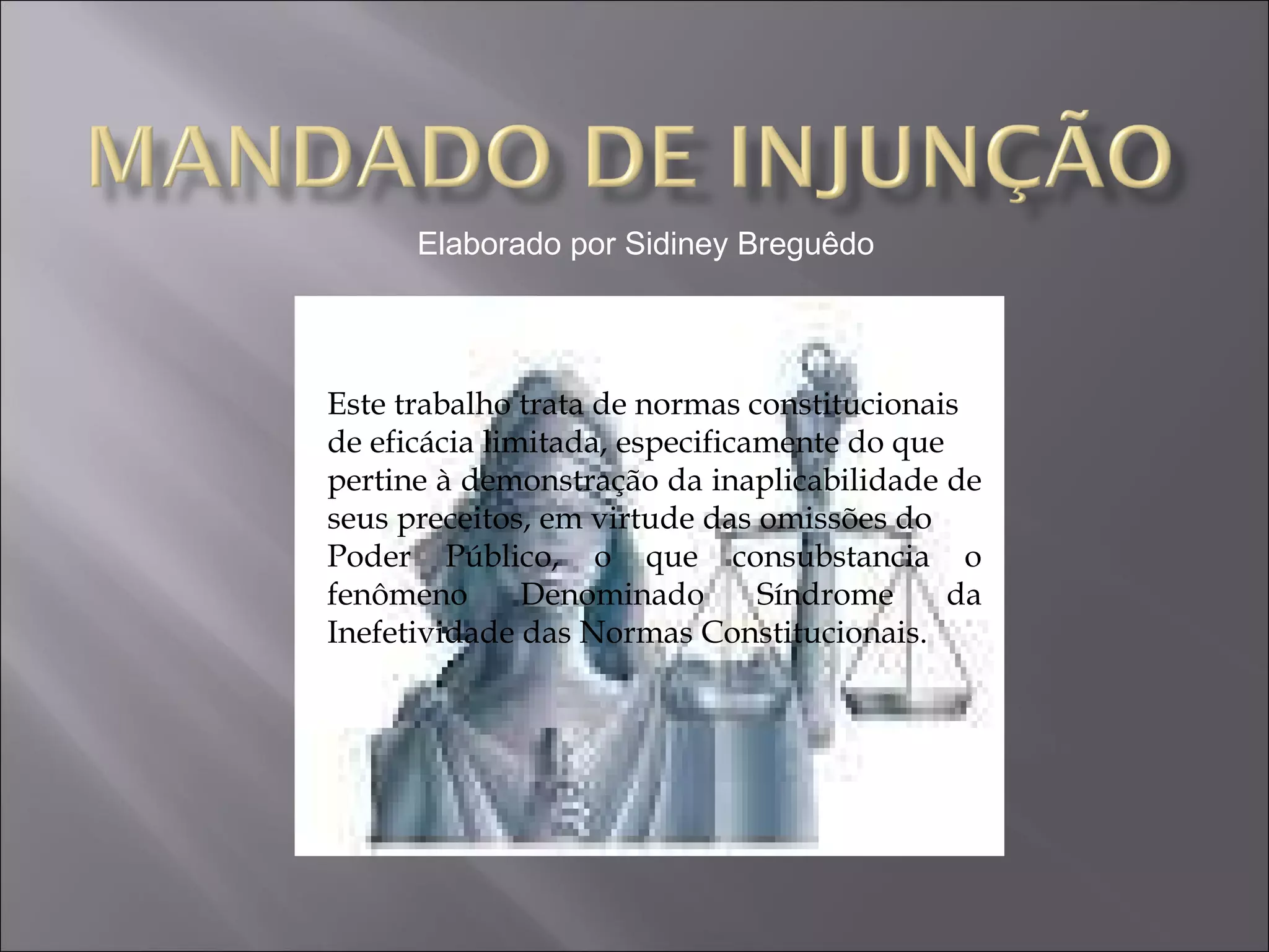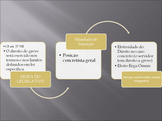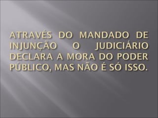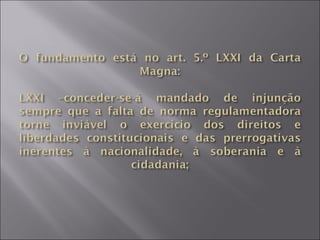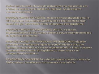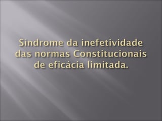 Este documento discute normas constitucionais de eficácia limitada, especificamente quando seus preceitos não podem ser aplicados devido à omissão do poder público. Isso constitui a "síndrome da inefetividade das normas constitucionais". O documento também descreve como o Supremo Tribunal Federal mudou de uma posição "não concretista" para uma posição "concretista geral", aplicando o mandado de injunção para sanar omissões legislativas em casos específicos.