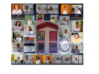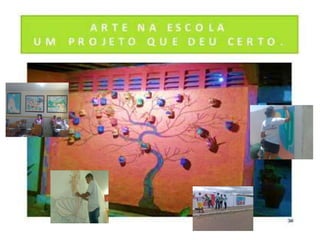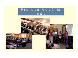 O documento descreve vários projetos educacionais de uma escola, incluindo um projeto de rádio, horta e adaptação de laboratório de informática. A apresentação foi feita por três pessoas e os créditos foram dados a Rejane Simone Soares.
