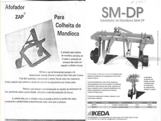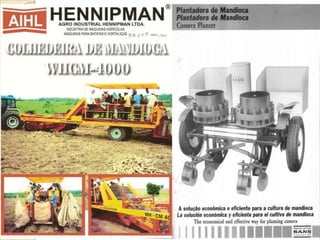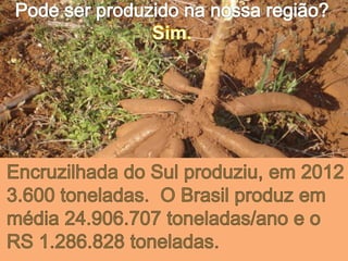 A mandioca é uma planta originária do Brasil cujas partes comestíveis são a raiz e os talos. Pode ser plantada de setembro a novembro em solos arenosos ou de textura média a uma distância de 0,8 a 1,5 metros entre linhas e 0,5 a 1 metro entre plantas. A colheita ocorre de abril a agosto quando as raízes estão secas e é feita manualmente ou com equipamentos agrícolas. A mandioca tem alta produtividade e pode render até 30 toneladas por hectare