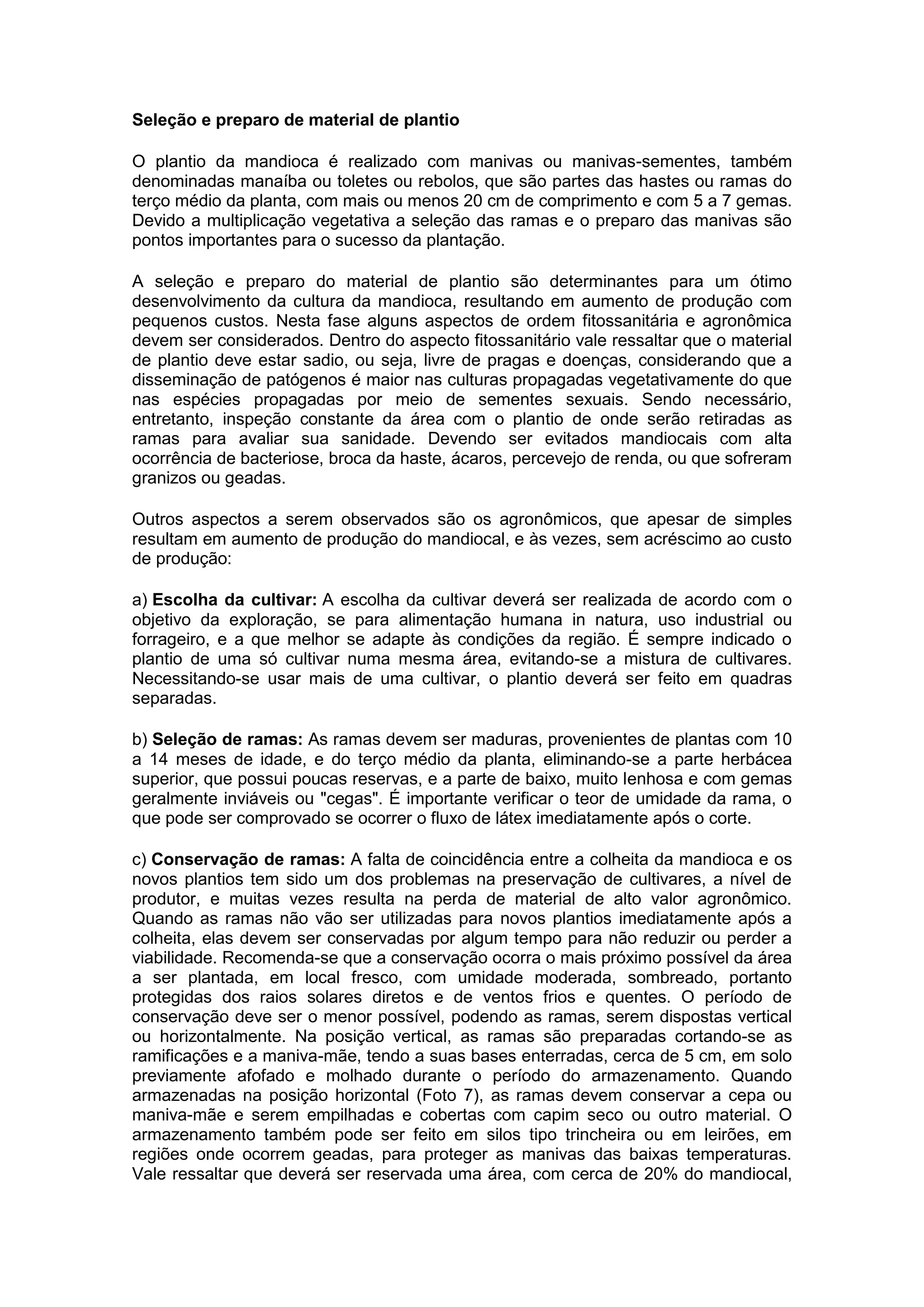O documento discute a seleção e preparo do material de plantio da mandioca, incluindo a escolha de ramas maduras e sadias, o corte e armazenamento correto de manivas, e a época e espaçamento ideal para o plantio. Fatores como a escolha da cultivar, sanidade e aspectos agronômicos das ramas são importantes para um bom desenvolvimento da cultura e aumento da produção.