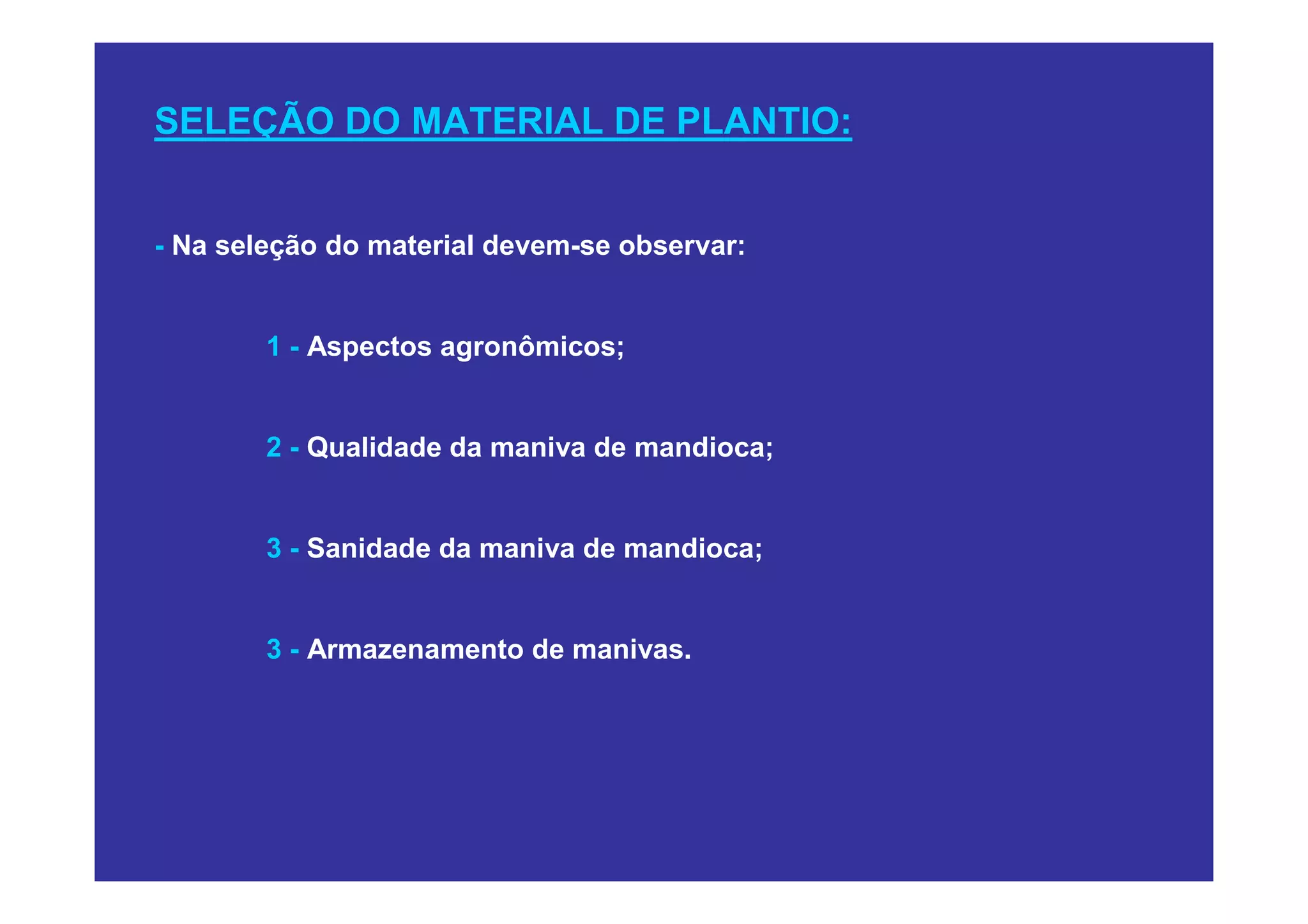 O documento discute a seleção do material de plantio de mandioca, mencionando a importância de observar aspectos agronômicos, qualidade e sanidade da maniva, além do armazenamento correto. Deve-se escolher manivas maduras, com o número adequado de nós e grossura, livres de danos ou patógenos, e armazená-las em local protegido e úmido.