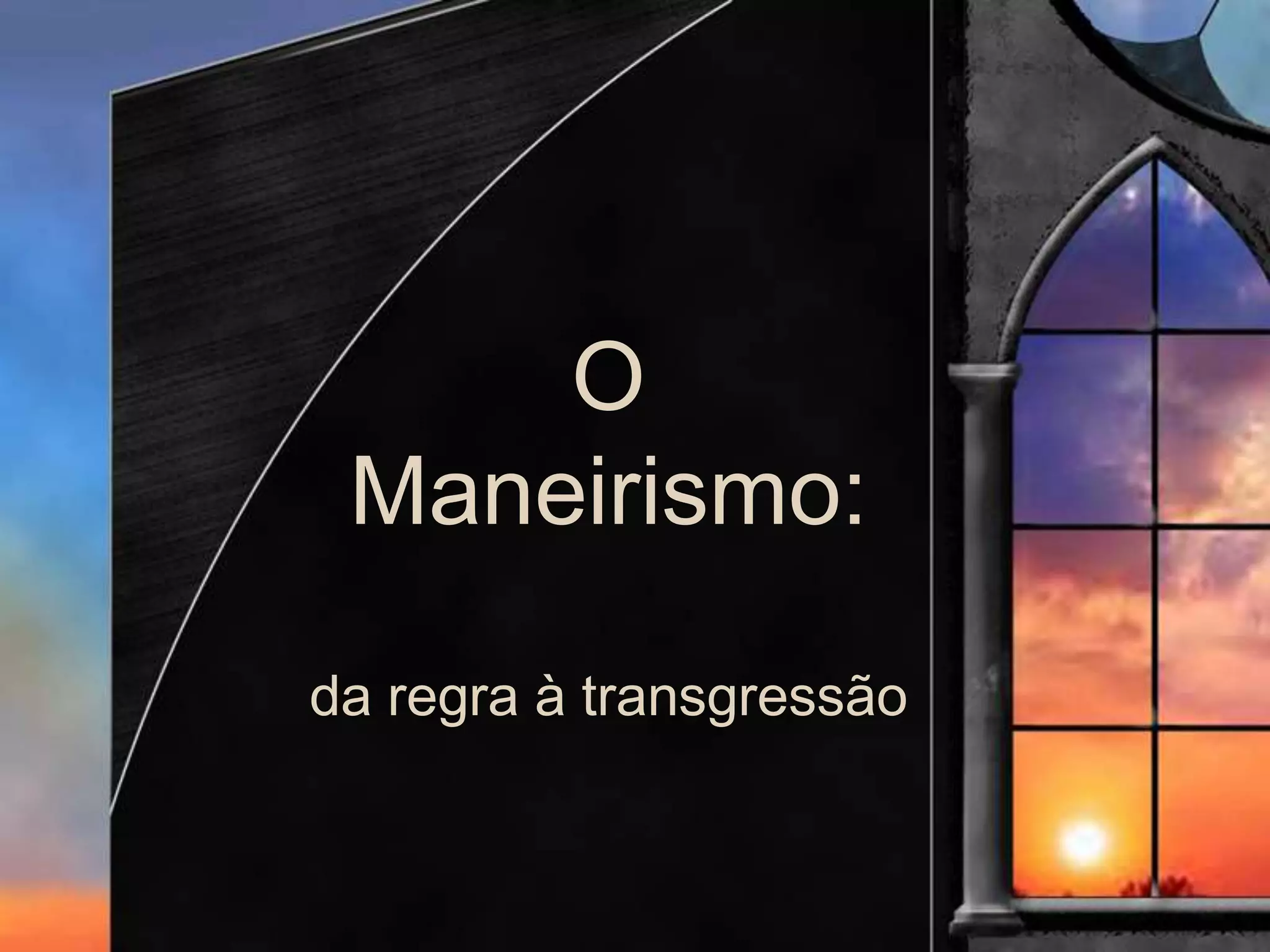 Este documento descreve o período artístico do Maneirismo, caracterizado por composições complexas e dinâmicas, uso de ilusão de ótica e figuras em escorço. Apresenta os principais artistas e estilos deste período na pintura, escultura e arquitetura na Itália e em outros países europeus.