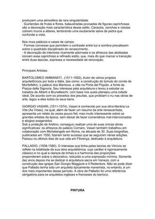 O documento descreve o estilo artístico maneirista que se desenvolveu em Roma entre 1520 e 1610. Caracterizado por formas estilizadas que extrapolavam os cânones clássicos, o maneirismo refletia um período de desordem após a Reforma. Na arquitetura destacam-se igrejas alongadas com decoração exuberante. Na pintura, figuras alongadas em composições tensas. Na escultura, grupos de figuras unidas por posturas forçadas. Artistas como El Greco, Giambologna
