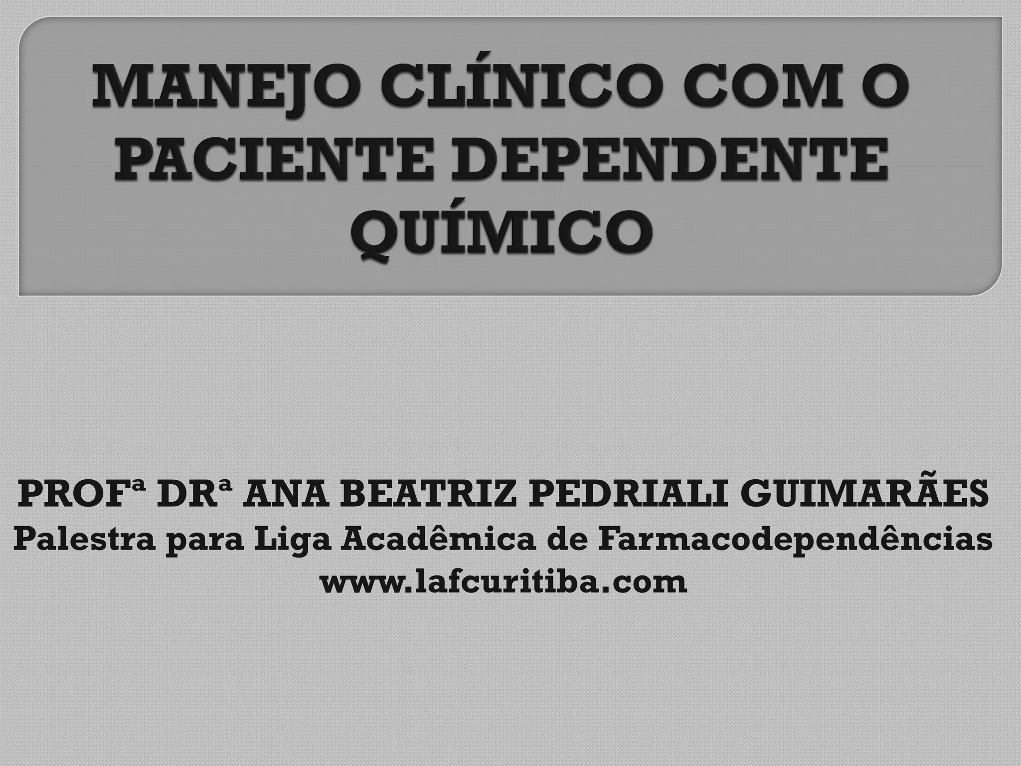 A palestra da Profa. Dra. Ana Beatriz Pedriali Guimarães aborda a dinâmica do tratamento de farmacodependências, discutindo as fases da mudança e a importância da relação terapêutica. Exemplos de casos clínicos enfatizam a negação do problema e a necessidade de um vínculo confiável entre terapeuta e paciente durante o processo de mudança. O documento também aborda a recaída e suas implicações nos contextos familiares e sociais dos pacientes.