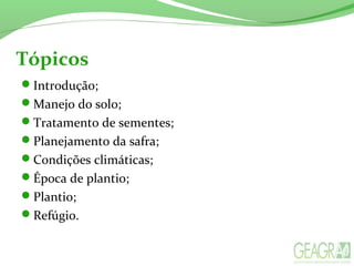 O documento discute o manejo de plantio do algodoeiro, abordando tópicos como preparo do solo, tratamento de sementes, planejamento das safras, época de plantio, população de plantas, refúgio e importância do vazio sanitário.