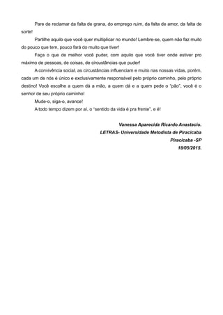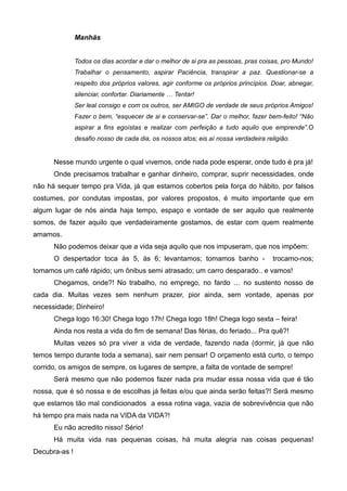 O documento discute a importância de viver a vida de acordo com os próprios valores e interesses, em vez de se deixar dominar por hábitos e responsabilidades impostas. Apesar das pressões do mundo moderno, é possível encontrar alegria nas pequenas coisas do dia a dia e tomar controle do próprio destino. Devemos compartilhar nossos dons com os outros e seguir em frente, buscando sempre avançar.