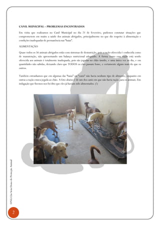 O documento é uma carta de uma ONG de proteção animal para o prefeito de Manhuaçu sobre as condições do canil municipal. A ONG relata problemas como desnutrição dos cães, alimentação inadequada, superlotação dos canis e falta de estrutura veterinária. A carta propõe um acordo de melhorias como adoção de protocolos de alimentação, higiene e castração, além de limitar eutanásia e ampliar visitação pública.