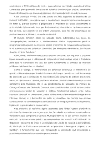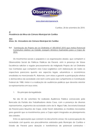 O documento pede que o projeto de lei sobre o potencial construtivo para a reforma do estádio para a Copa de 2014 seja processado regularmente pelas comissões da Câmara Municipal com audiências públicas. A transferência de potencial construtivo deve seguir a lei e ter como objetivo o interesse público, não individual. A participação da população é essencial para garantir a legalidade e legitimidade dos projetos que afetam a cidade.