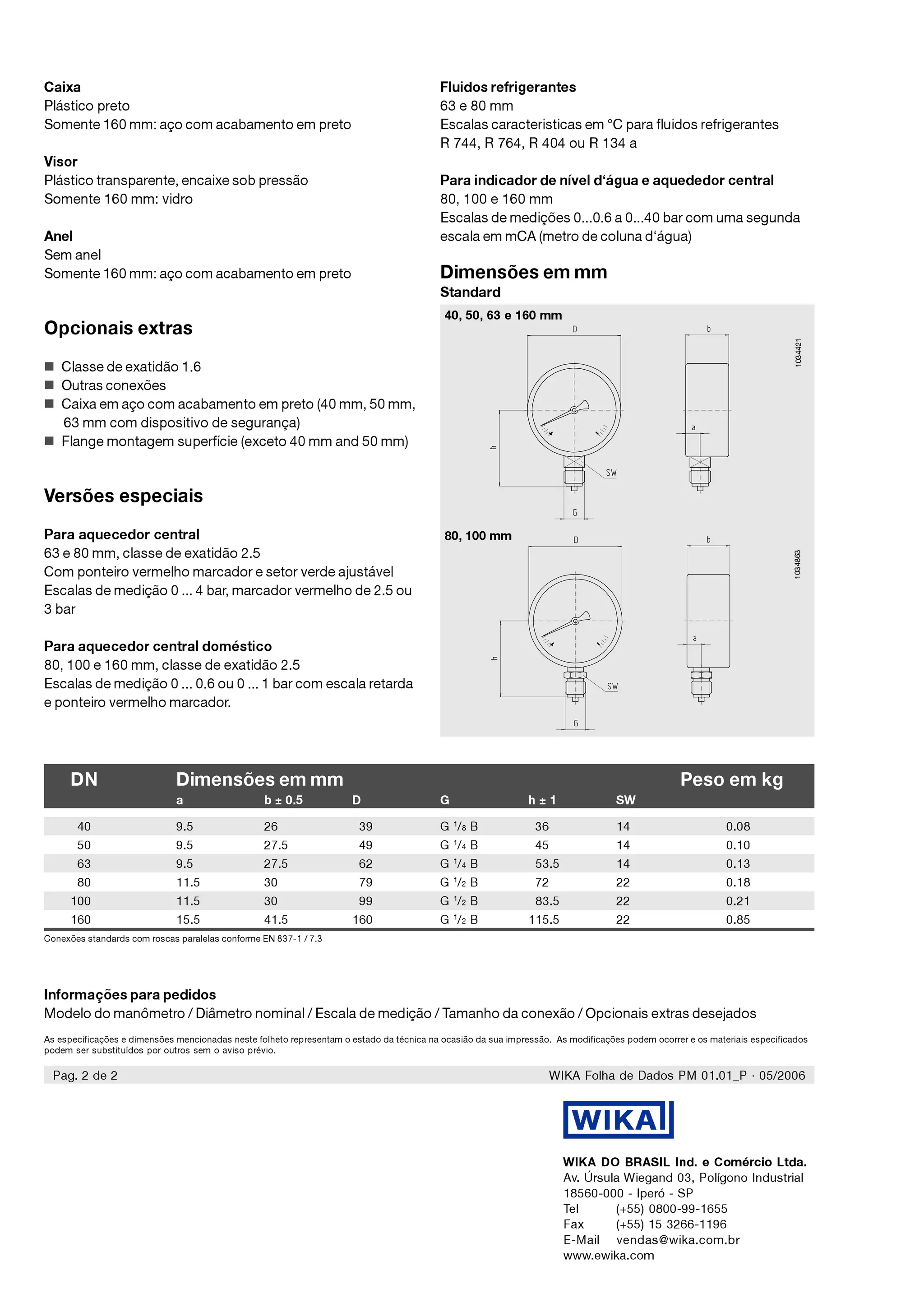 Este documento fornece especificações técnicas para manômetros de tubo Bourdon, incluindo dimensões, materiais, escalas de medição, classes de precisão e opções. É descrito o design de acordo com a norma EN 837-1 e são listados os diâmetros nominais, conjuntos de escalas e conexões disponíveis.