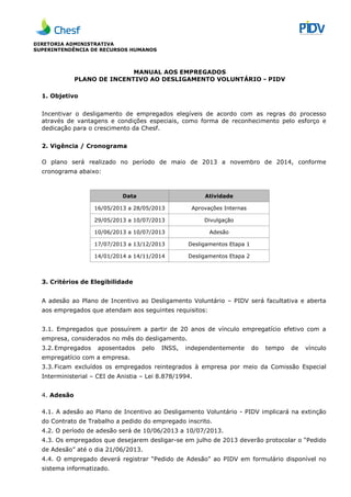 O documento descreve um Plano de Incentivo ao Desligamento Voluntário oferecido pela empresa, com o objetivo de incentivar o desligamento de funcionários elegíveis. O plano prevê vantagens como indenizações calculadas com base no tempo de serviço e limites máximos. Também estabelece critérios de elegibilidade, cronograma, procedimentos de adesão e exclusões.