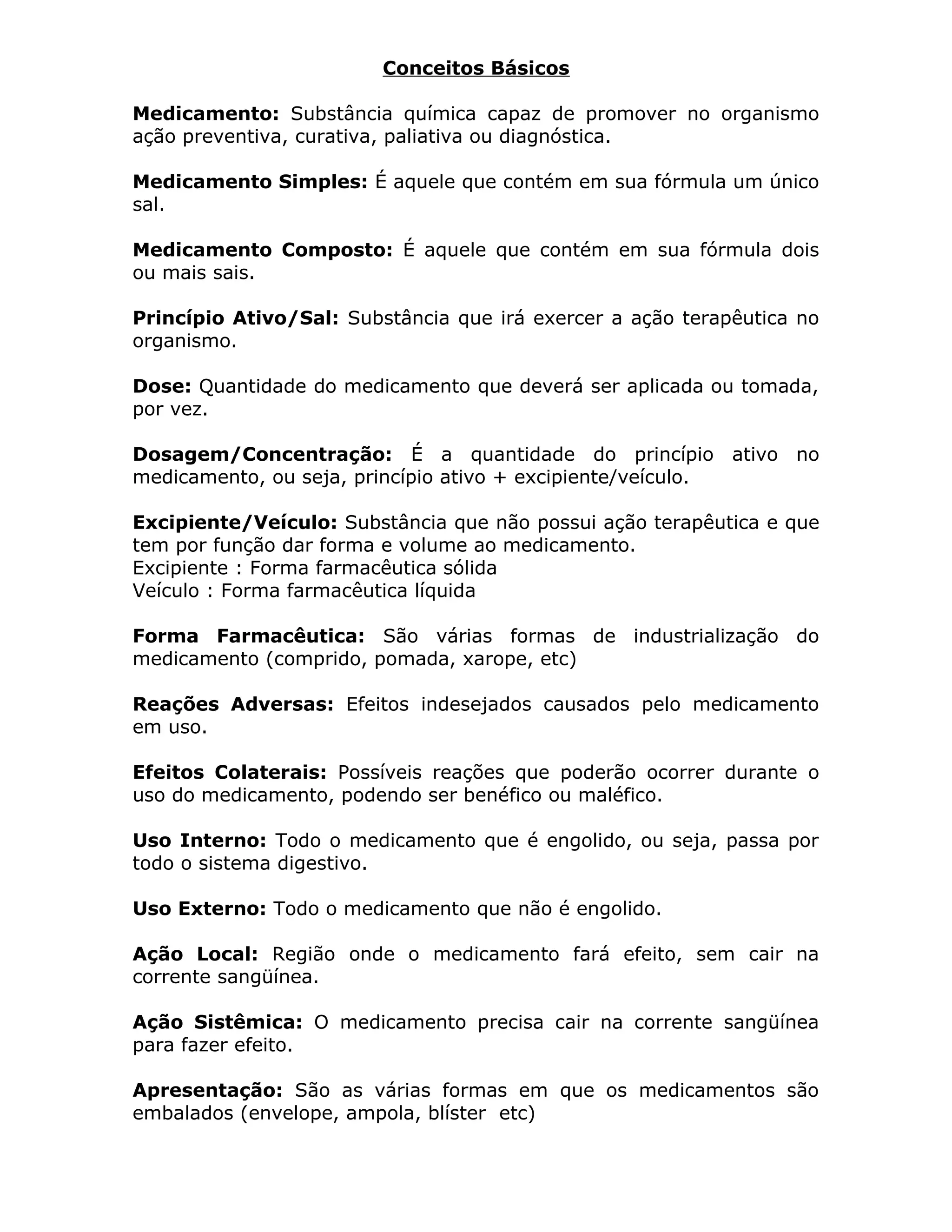 O documento fornece conceitos básicos sobre medicamentos, incluindo suas definições, formas farmacêuticas, vias de administração e informações sobre uso. Aborda termos como princípio ativo, dose, excipiente, forma farmacêutica, ação local e sistêmica, reações adversas, uso interno e externo. Também explica diferentes tipos de medicamentos e suas apresentações.