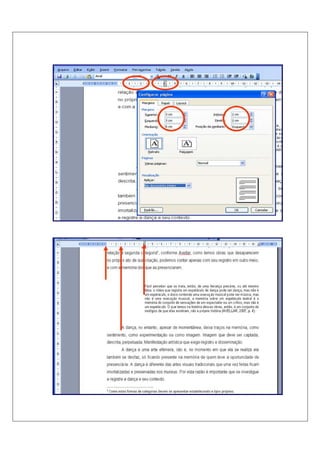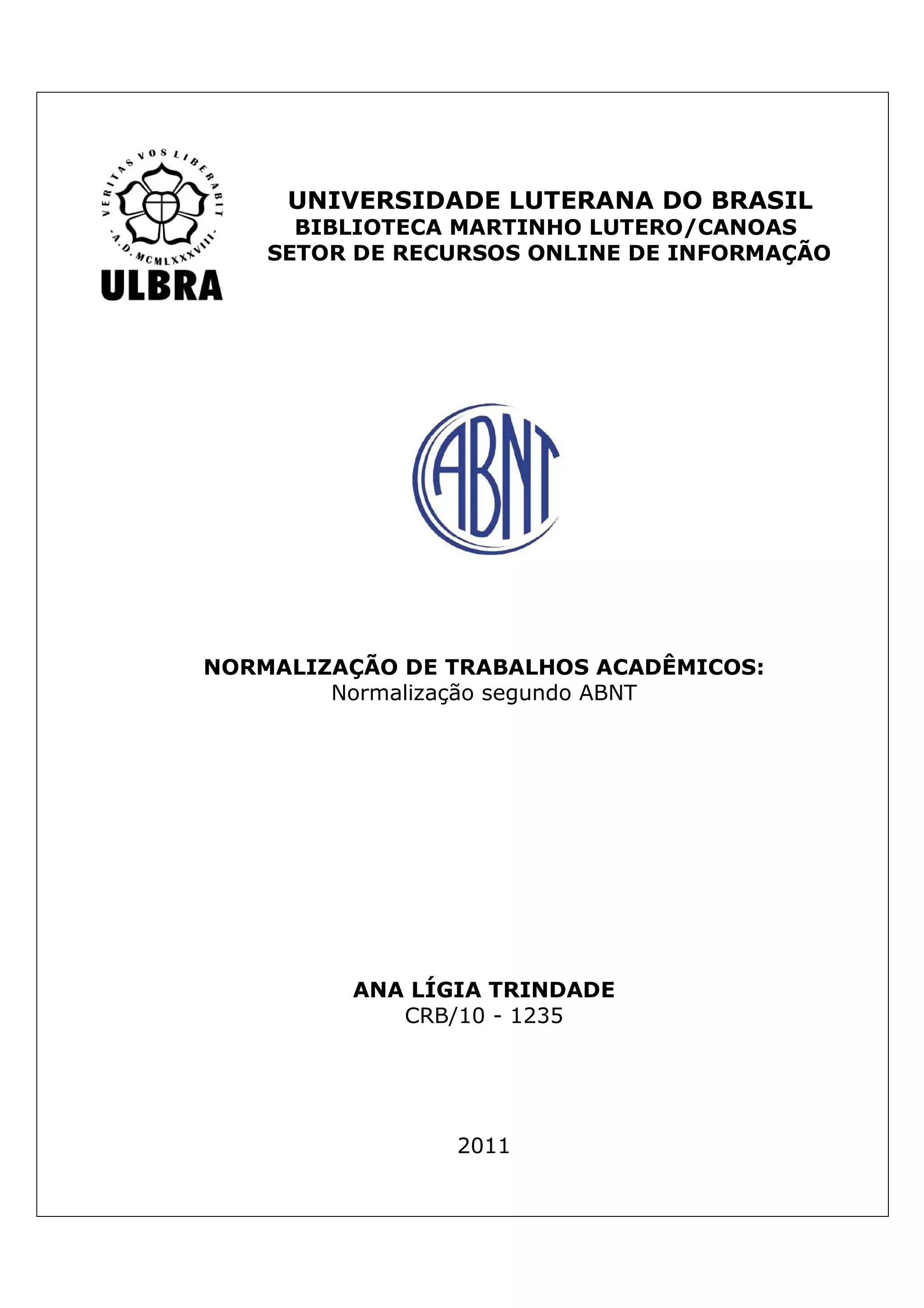 O documento descreve as normas da ABNT para normalização de trabalhos acadêmicos, incluindo estrutura, formatação, elementos obrigatórios e opcionais como capa, folha de rosto, resumo, lista de ilustrações. Detalha requisitos para projetos, monografias, dissertações, teses, artigos e pôsteres como margens, espaçamento, paginação e fontes.