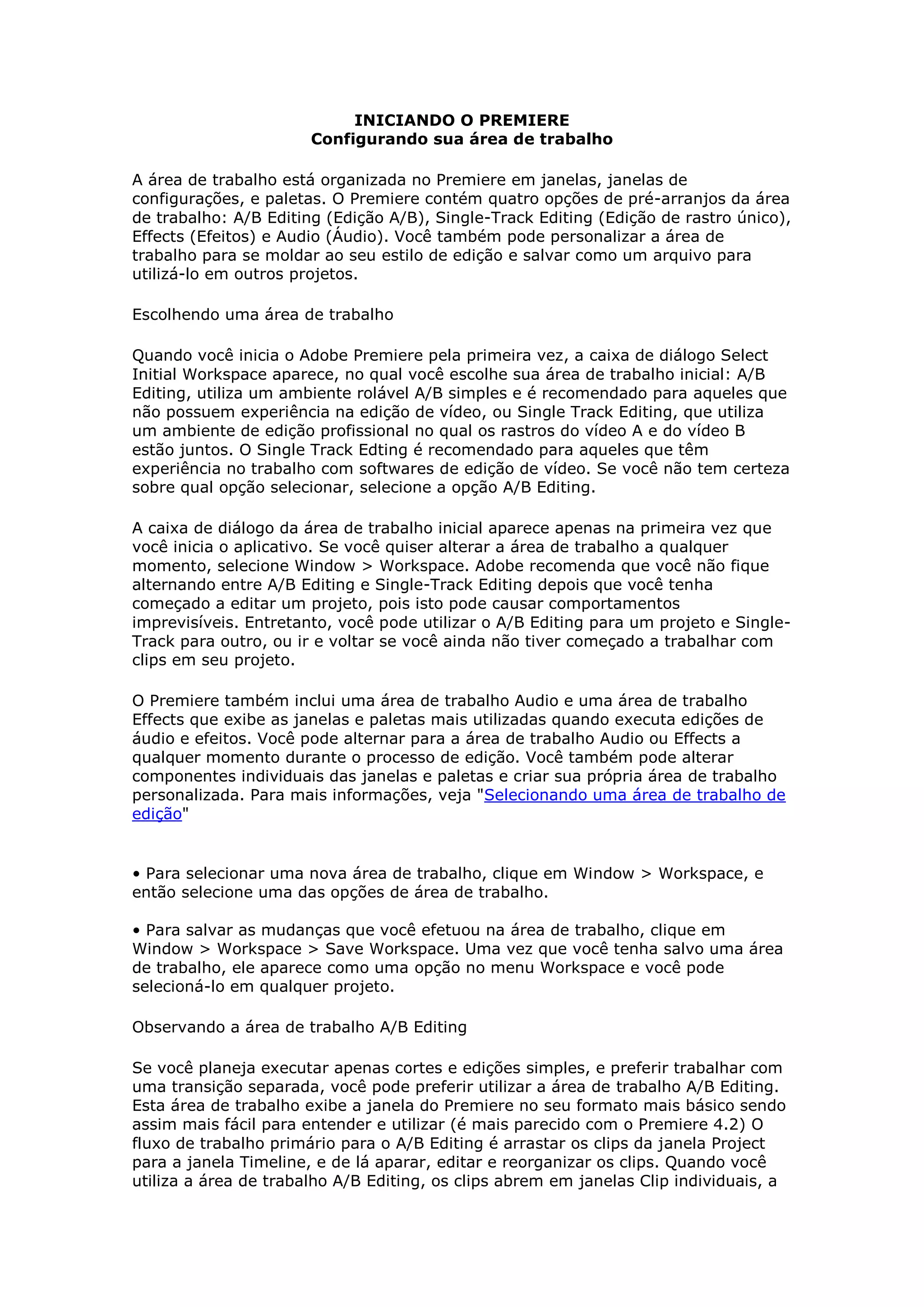 Este documento fornece uma introdução às áreas de trabalho e ferramentas básicas do Adobe Premiere. Explica como configurar a área de trabalho inicial, importar e organizar clips de vídeo e áudio, e utilizar a janela Monitor para pré-visualizar e editar clips na linha do tempo.