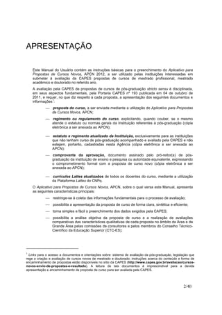 1) O documento fornece instruções sobre como preencher e enviar propostas de cursos novos de pós-graduação stricto sensu utilizando o Aplicativo para Propostas de Cursos Novos (APCN) da Coordenação de Aperfeiçoamento de Pessoal de Nível Superior (CAPES).