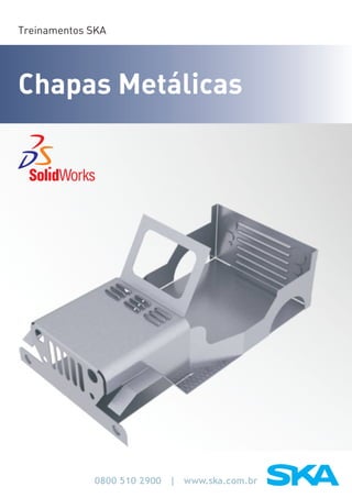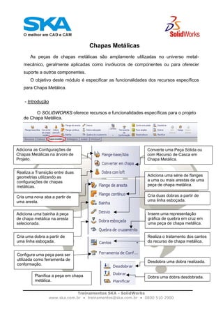 O documento fornece informações sobre treinamentos em projetos de chapas metálicas no SolidWorks. Detalha os recursos para criação de chapas metálicas, como Flange-Base/Aba, conversão de peças sólidas em chapas e dobra com Loft. Inclui exercícios para aplicar esses recursos.