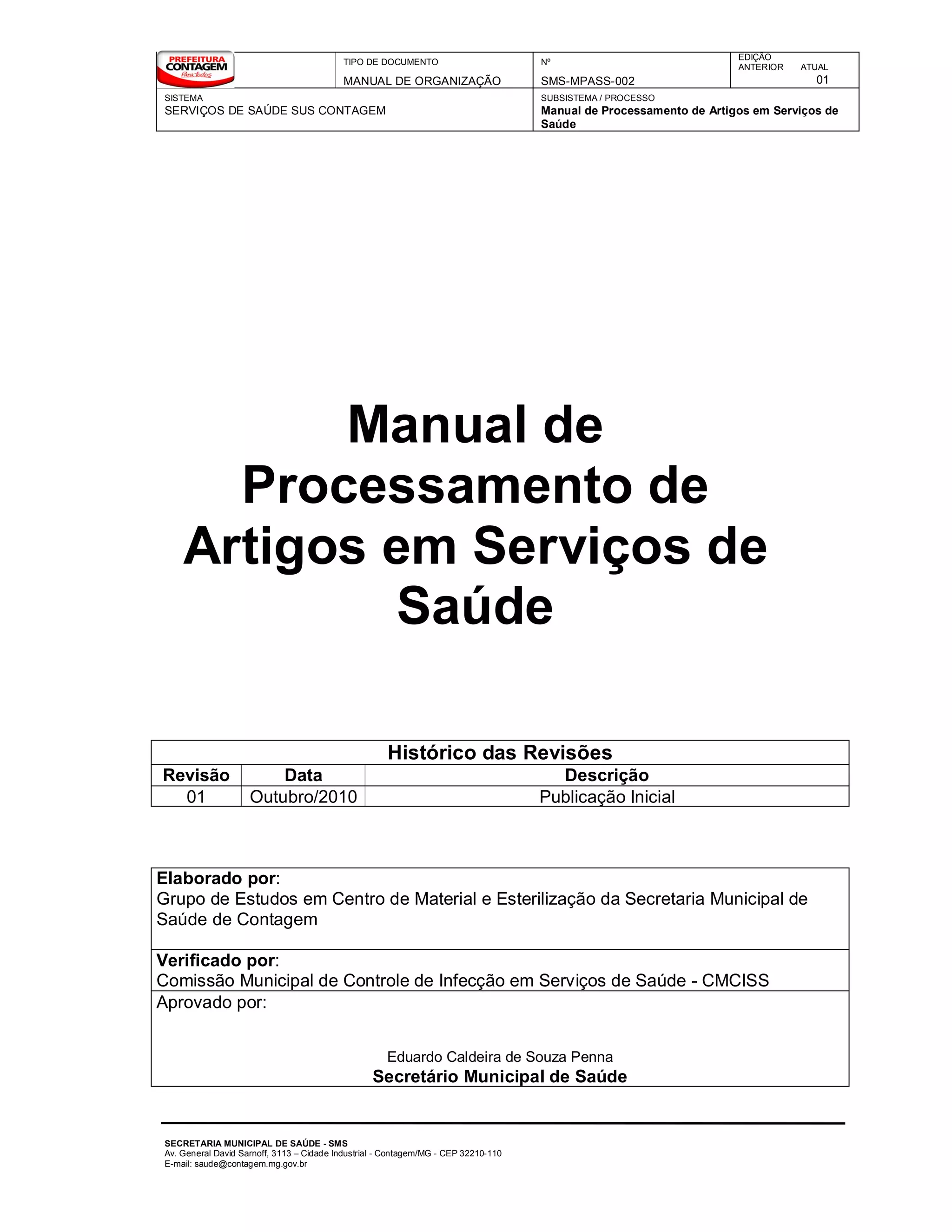 O documento apresenta um manual de organização sobre processamento de artigos em serviços de saúde com informações sobre estrutura física de centrais de material e esterilização, classificação e tratamento de artigos, métodos de limpeza, desinfecção e esterilização, bem como normas e instruções para o processamento de diferentes tipos de artigos e equipamentos médicos.