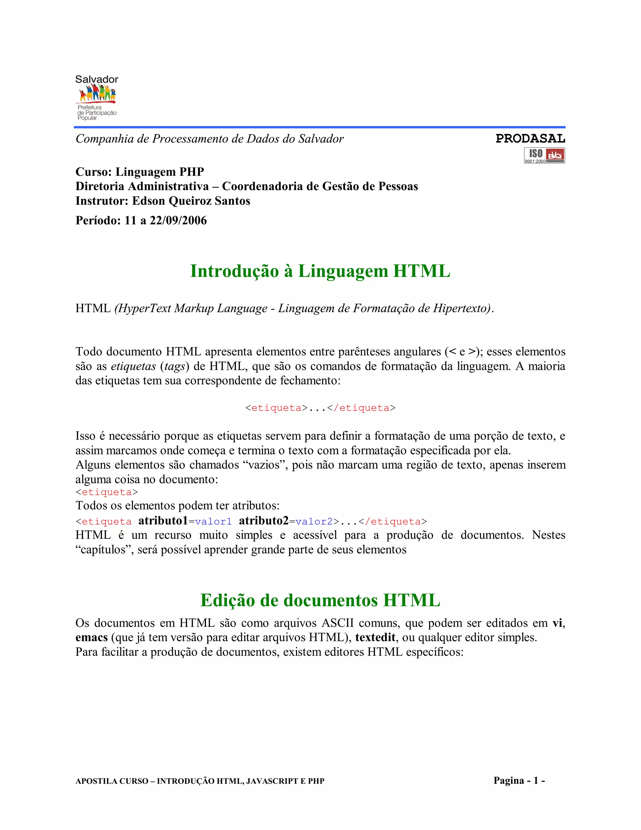 1) O documento apresenta uma introdução ao HTML, incluindo elementos, atributos e estrutura básica de um documento HTML.