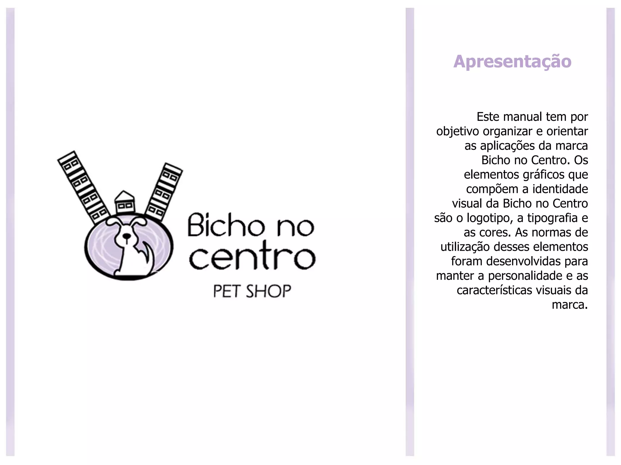 Este manual apresenta as diretrizes para uso da marca "Bicho no Centro", incluindo seu logotipo, cores, tipografias e regras de aplicação em diferentes meios. A marca representa a empresa de acordo com três conceitos: demonstração dos animais como elemento central, localização da sede no centro da cidade, e transmissão de afetividade e suavidade no tratamento aos bichos.
