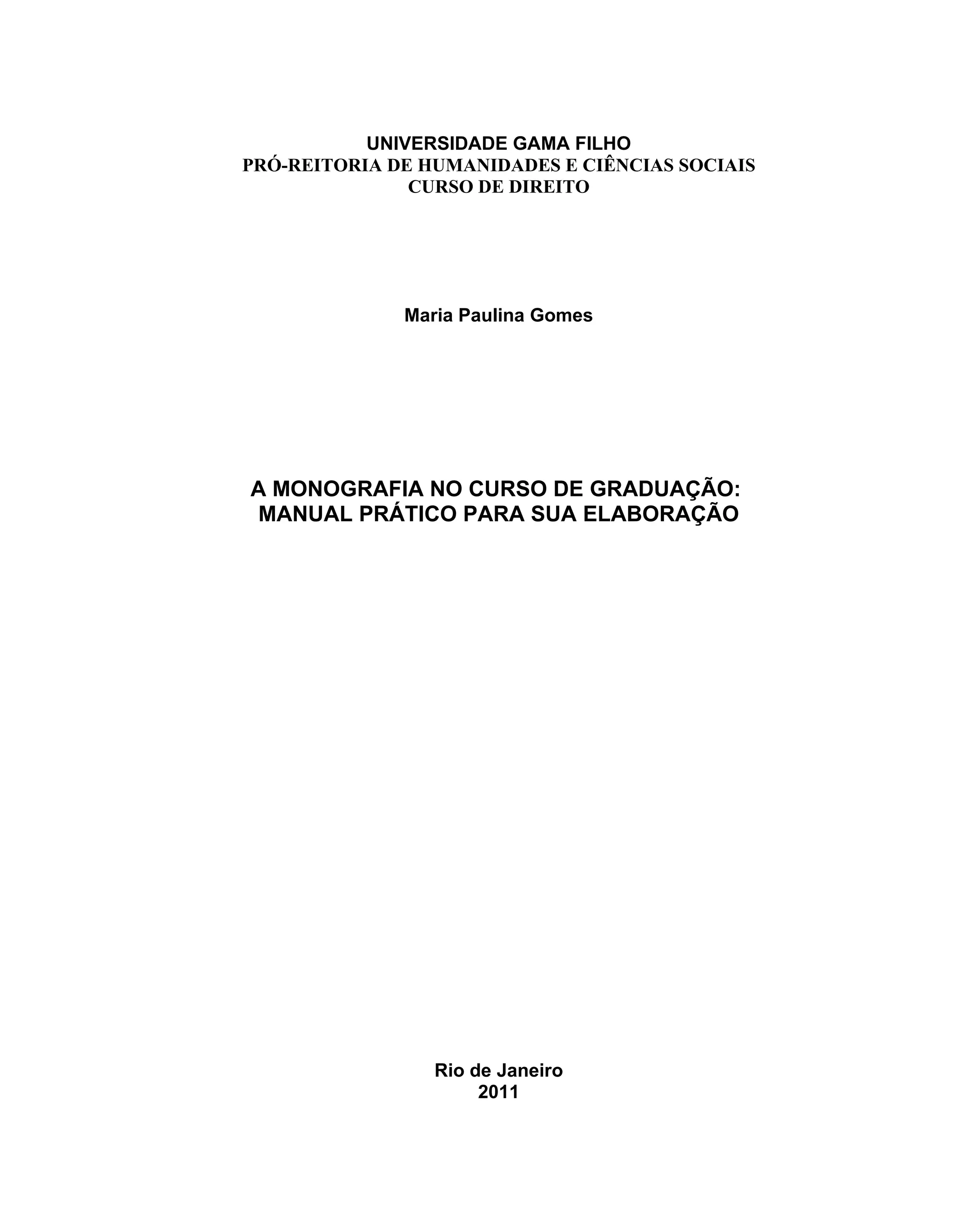 Este manual fornece instruções sobre a estrutura e formatação de monografias para estudantes de Direito da Universidade Gama Filho no Rio de Janeiro. O documento explica os elementos pré-textuais, textuais e pós-textuais de uma monografia, como introdução, desenvolvimento por capítulos, conclusão, referências e apêndices. O objetivo é padronizar os trabalhos monográficos e orientar os estudantes no processo de elaboração.