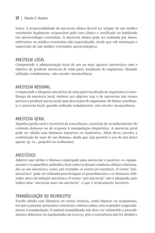 O documento define termos importantes utilizados em anestesiologia veterinária, como anestesia, anestesia geral, anestesia local, sedação, analgesia e hipnose. Ele também descreve vias comuns de administração de fármacos anestésicos e técnicas de acesso venoso.