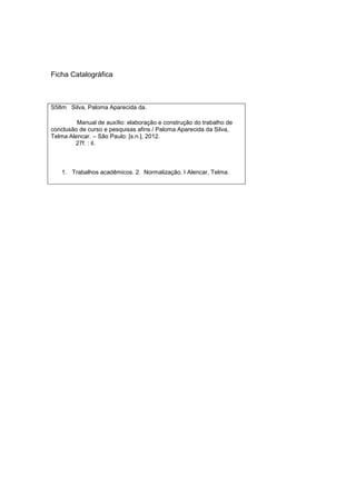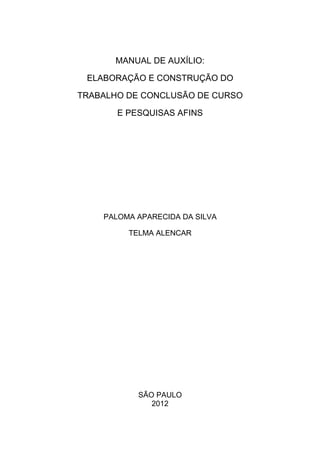 O documento apresenta um manual de auxílio para a elaboração de trabalhos acadêmicos, como trabalhos de conclusão de curso e pesquisas. O manual descreve a estrutura desses trabalhos, dividida em elementos pré-textuais, textuais e pós-textuais. Inclui modelos e explicações detalhadas sobre cada elemento, como capa, folha de rosto, resumos, lista de figuras, referências e outros itens necessários para a formatação correta dos trabalhos de acordo com as normas da ABNT.