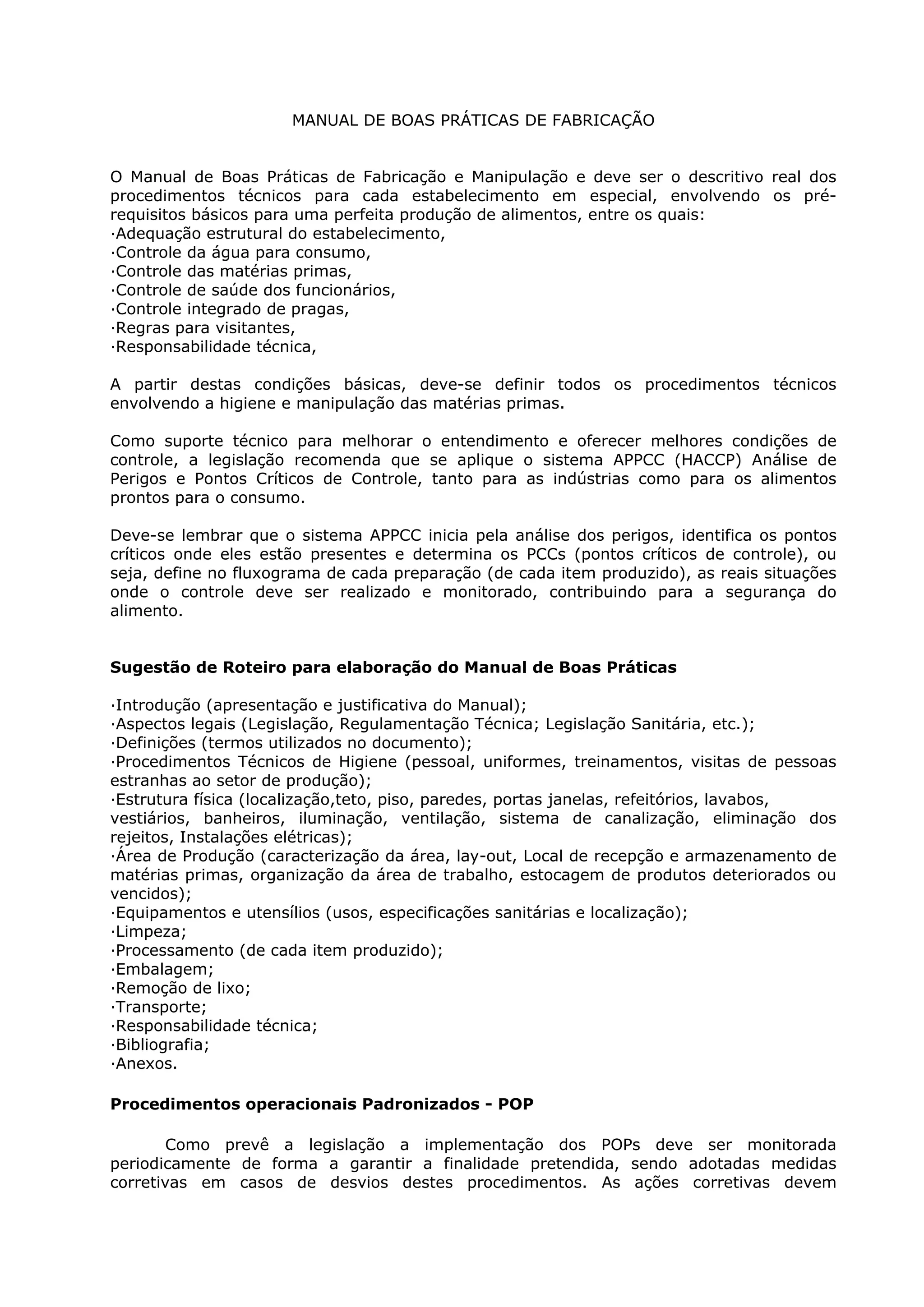 O documento discute as boas práticas de fabricação para alimentos, incluindo requisitos estruturais e de higiene, controle de matérias-primas e funcionários, e recomenda a adoção do sistema HACCP. Também fornece sugestões para a elaboração de manuais de boas práticas e procedimentos operacionais padronizados, com exemplos.